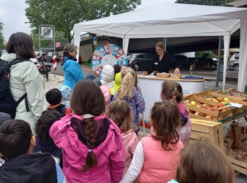 Neben den kulinarischen Genüssen beim fairen Frühstück sowie den glücklichen Gewinnern beim Glücksrad wurde beim Wochenmarkt-Jubiläum auch zur Mülltrennung informiert. Im Rahmen der Kampagne „Deutschland trennt. Du auch?“ war der AWB mit einem Info-Stand vor Ort und der Trenn-Bär der Initiative „Mülltrennung wirkt“ vermittelte spielerisch Wissen zum richtigen Umgang mit Müll.