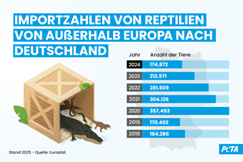 Aktuellen von PETA recherchierten EUROSTAT-Daten zufolge wurden 2024 circa 174.872 Reptilien aus Nicht-EU-Ländern nach Deutschland importiert. 2019 waren es rund 170.000 Tiere. Während der Corona-Pandemie stiegen die Importe stark an und erreichten 2020 über 357.000. Nun haben sich die Zahlen auf das Vorkrisenniveau eingependelt,doch der Handel geht ungebremst weiter.