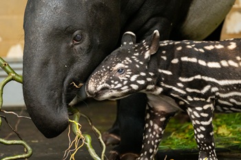 Schabrackentapire gelten in ihrer natürlichen Heimat,den tropischen Wäldern in Malaysia,Myanmar,Thailand und auf der indonesischen Insel Sumatra als stark gefährdet. Die Weltnaturschutzunion IUCN geht von nur noch 2.500 erwachsenen Tieren aus. Aufgrund von Lebensraumzerstörung und illegaler Bejagung geraten die mittlerweile oft zersplitterten Teilpopulationen immer mehr unter Druck. Umso wichtiger ist es,dass Zoos eine Verantwortung für die Art übernehmen,indem sie Reservepopulationen in menschlicher Obhut bewahren und weiterentwickeln. Die Geburt des Schabrackentapirkalbs Melati im Oktober 2024 in der Wilhelma war in diesem Zusammenhang ein aufsehendes Ereignis für die Zoowelt. Wilhelma-Direktor Dr. Thomas Kölpin,der gleichzeitig Kurator für die Schabrackentapire ist,verrät,warum: „Das Ex Situ-Zuchtprogramm des europäischen Zooverbands EAZA umfasst nur rund 50 Exemplare dieser charismatischen Art. Darum ist jedes einzelne geborene Tier so ungeheuer wichtig.“