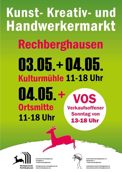 Die Gemeinde Rechberghausen und die Kulturmühle laden zum diesjährigen Kunst-,Kreativ- und Handwerkermarkt ein. Der Markt hat am 03. und 04. Mai in der Kulturmühle und am 04. Mai in der Ortsmitte jeweils von 11 bis 18 Uhr seine Pforten geöffnet.