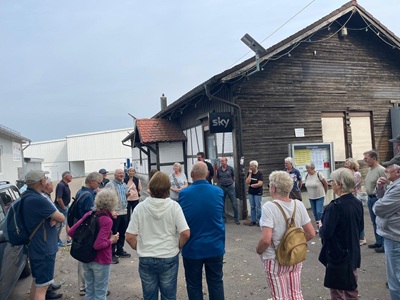 Der Vorsitzende der Salacher Modellbauer,Jürgen Wendel,ermöglichte hernach noch ein Beisammensein im alten Bahnhof,der über längere Jahre nun schon als Vereinstreff dient. Werner Staudenmayer und Hümeyra Mracic,welche mit Alex Gaugele und Peter Hofelich zum ‚Orga-Team‘ für die Orts-Spaziergänge gehören,verlosten und übergaben den ersten Preis beim Quiz ‚Wer kennt sich aus am Bahnübergang?‘. Gewonnen hat mit Angelika Voith eine liebenswerte und waschechte Salacherin. Viel bestaunt und Gesprächsstoff auch Fotografien aus der damaligen Zeit,die Ortsarchivar Alexander Gaugele mitgebracht hatte.