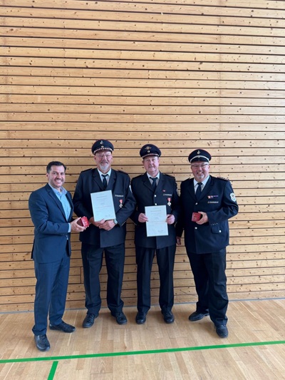 Ein besonderer Moment des Festes war die Ehrung zweier Geislinger Feuerwehrmänner: Wolfgang Bührle und Frank Preßmar wurden für jeweils 40 Jahre aktive Mitgliedschaft von Kreisbrandmeister Dr. Michael Reick und Landrat Markus Möller ausgezeichnet.