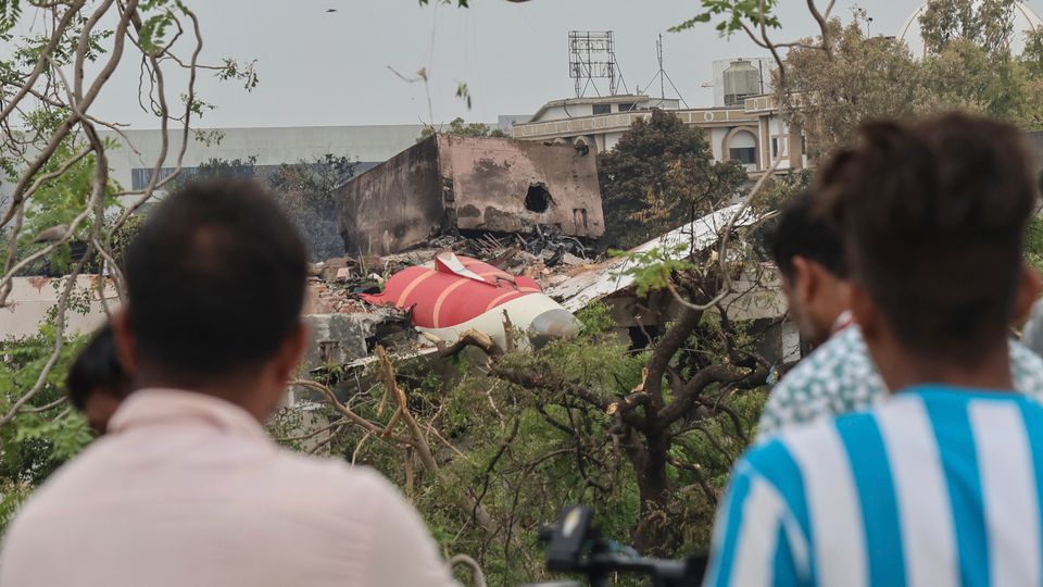 Menschen schauen zu den Trümmerteilen der abgestürzten AI171