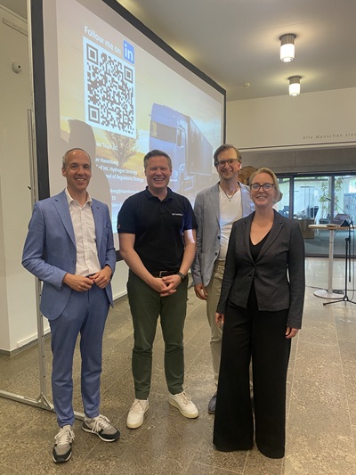 Foto: Veranstaltung „Woche des Wasserstoffs“; v.l.n.r – Johannes Züfle,Nicholas Loughlan,Volker Hasenberg und Isabell Knüttgen; Bildquelle: cellcentric