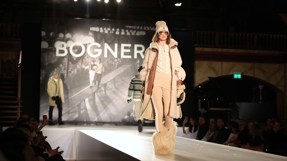 Ein Model präsentiert einen Look des Labels Bogner bei einer Modenschau in München (2023)