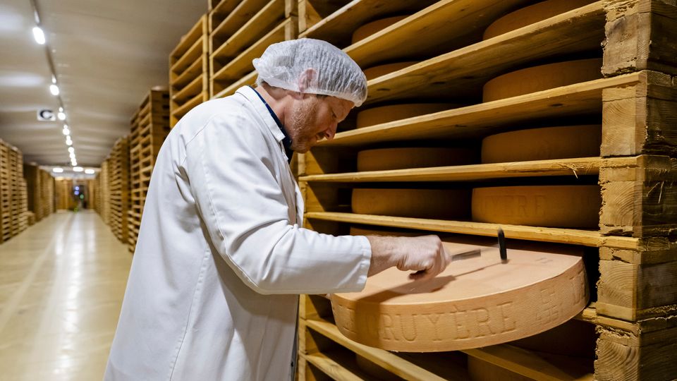 Qualitätskontrolle von Gruyère in einem Reifekeller der Schweizer Emmi-Gruppe