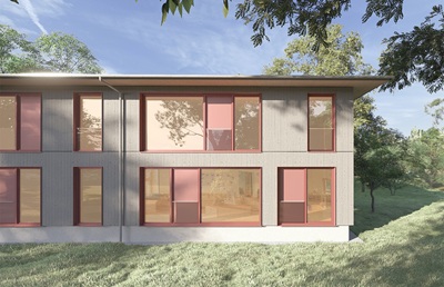 Der Neubau wird in nachhaltiger Holzelementbauweise vorgefertigt und vor Ort montiert. Ein großzügig überstehendes Satteldach schützt die Holzkonstruktion vor Verwitterung sowie herunterfallenden Ästen und setzt gleichzeitig neue architektonische Akzente. Als Basis für den Neubau dient das bereits vorhandene Betonfundament des früheren Provisoriums aus dem Jahr 2019,das entsprechend erweitert wird.