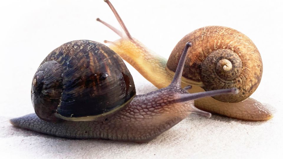 Ned (rechts im Bild) mit seinem linksgewundenen Gehäuse im Vergleich zu einer gewöhnlichen Gartenschnecke mit einem rechtsgewundenen Gehäuse