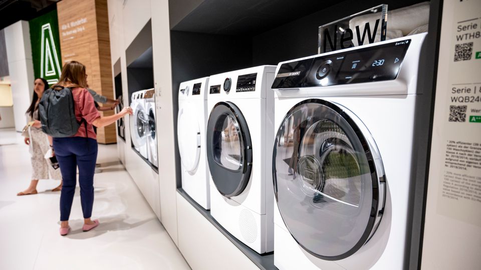 Besucher betrachten auf der Elektronikmesse IFA 2022 Waschmaschinen von Bosch