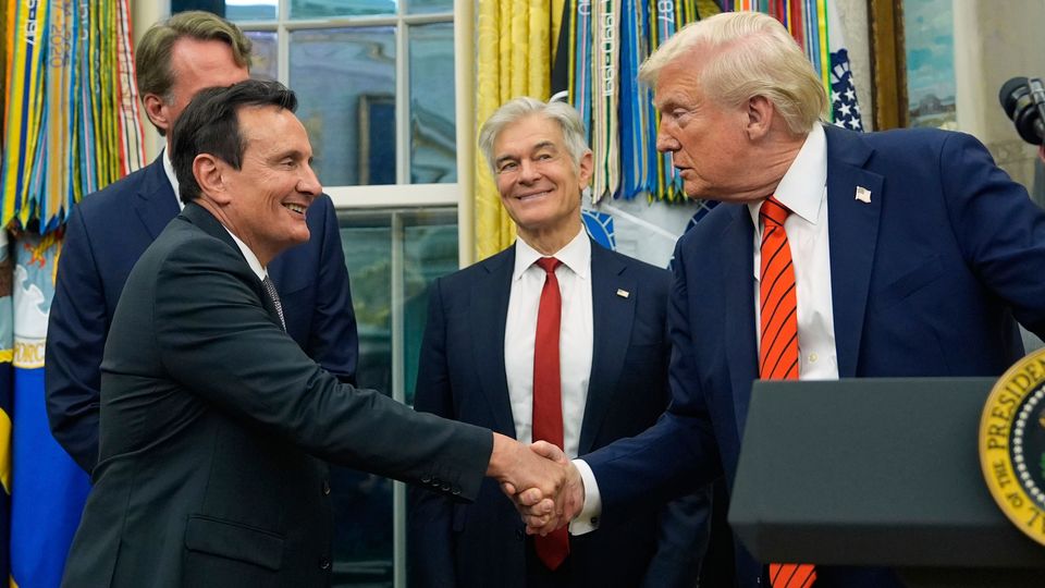 AstraZeneca CEO Pascal Soriot und US-Präsident Donald Trump beim Handschlag