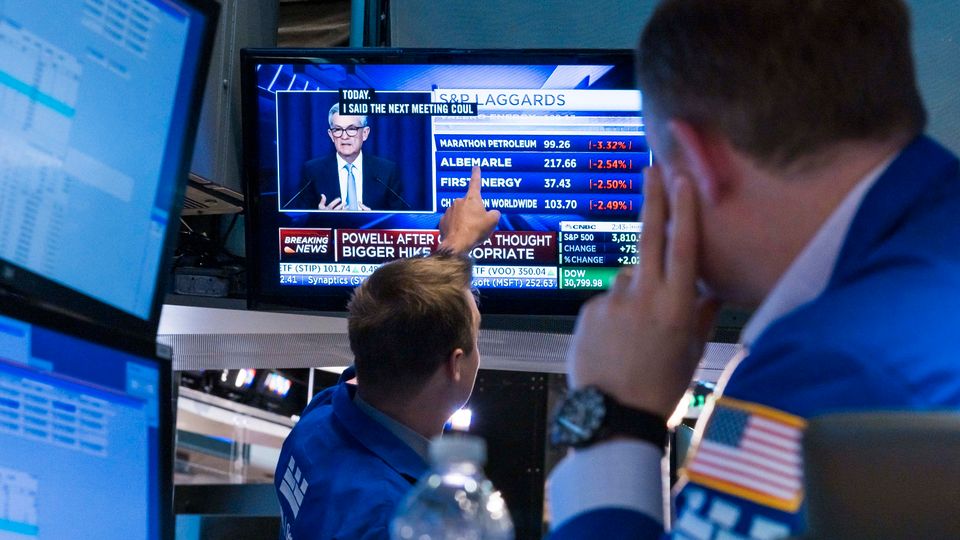 Börsenhändler sehen Fed-Chef Jerome Powell auf einem TV-Bildschirm (2022)