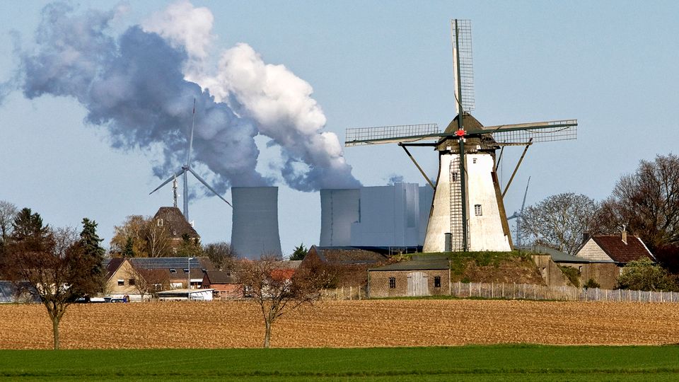 Grottenhertener Windmühle vor dem Braunkohlekraftwerk Neurath in Nordrhein-Westfalen