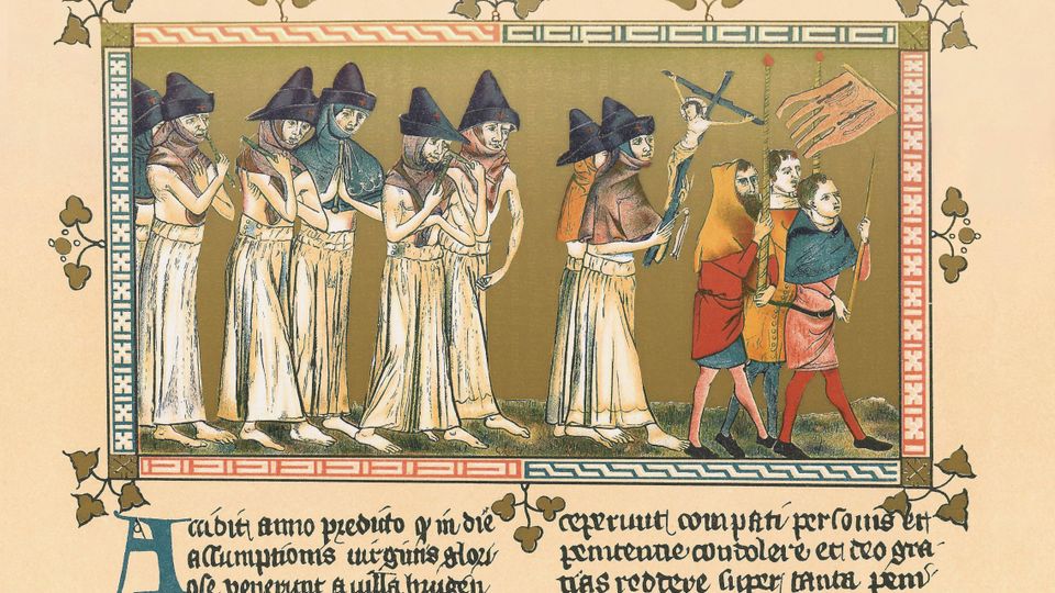 Flagellanten in Belgien beten für Schutz vor dem Schwarzen Tod (Miniaturmalerei aus der Mitte des 14. Jahrhunderts): »Perfekter Sturm« aus vielen Faktoren führte zu Pestwelle