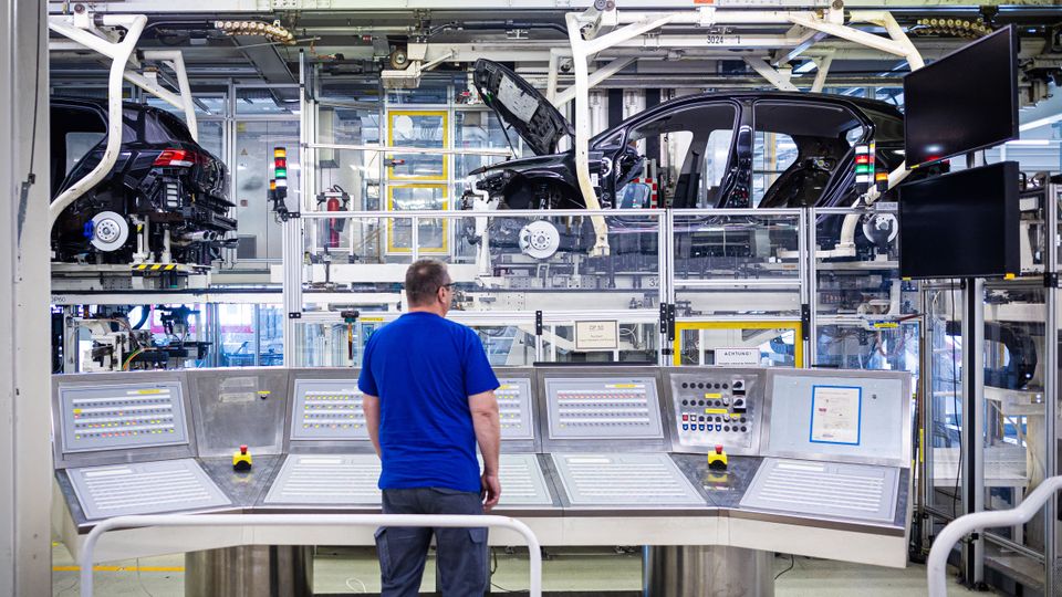 Mitarbeiter vor einer Fertigungsstrecke in VW-Werk