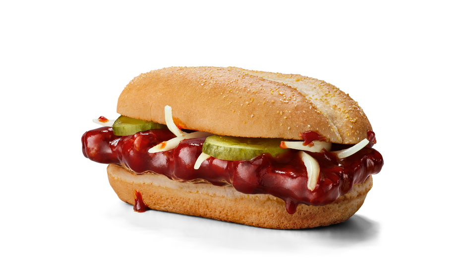 Der McRib ist ein beliebter Burger bei McDonald's. Er besteht aus einem Weizenbrötchen,in dessen Mitte Gewürzgurken- und Zwiebeln liegen,dazu Barbecuesoße. Der Clou des Burgers: Zerkleinerte Schweinefleischstücke in Rippchenoptik bilden das Burgerpatty. McDonald's spricht von »gewürztem Schweinefleisch ohne Knochen«.