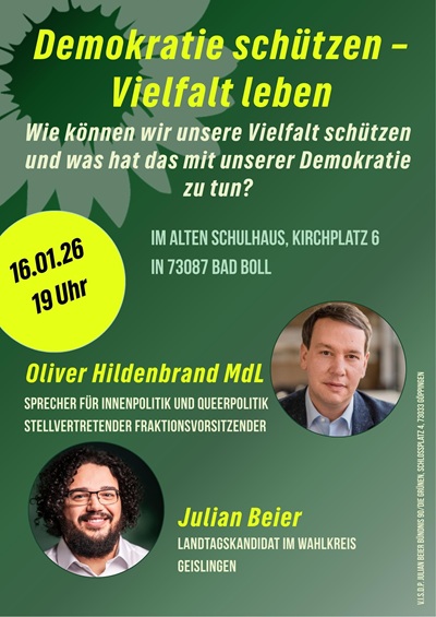 Gemeinsam sprechen wir über Demokratie,gesellschaftliche Vielfalt und aktuelle politische Herausforderungen im Land.👉 Eine Anmeldung per E-Mail an landtagswahl-geislingen@gruene-gp.de erleichtert uns die Planung. Vielen Dank!PM Büro Julian Beier