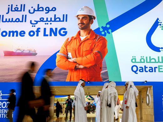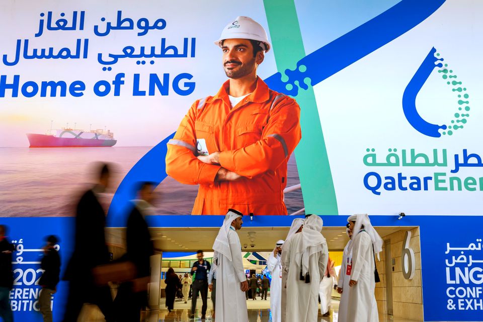 Reklame von Qatar Energy bei einer Fachkonferenz zu Flüssigerdgas (LNG): Die einzige Exportroute zum Rest der Welt ist de facto gesperrt